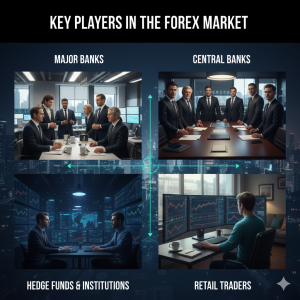 نقش بازیگران کلیدی، از بانک‌های تجاری و صندوق‌های پوشش ریسک تا بانک‌های مرکزی و معامله‌گران خُرد، در پویایی و کارآمدی این بازار بسیار مهم است. هر یک از این نهادها با اهداف و استراتژی‌های خود، تأثیر عمیقی بر نوسانات ارزها و رشد بازار جهانی فارکس دارند.